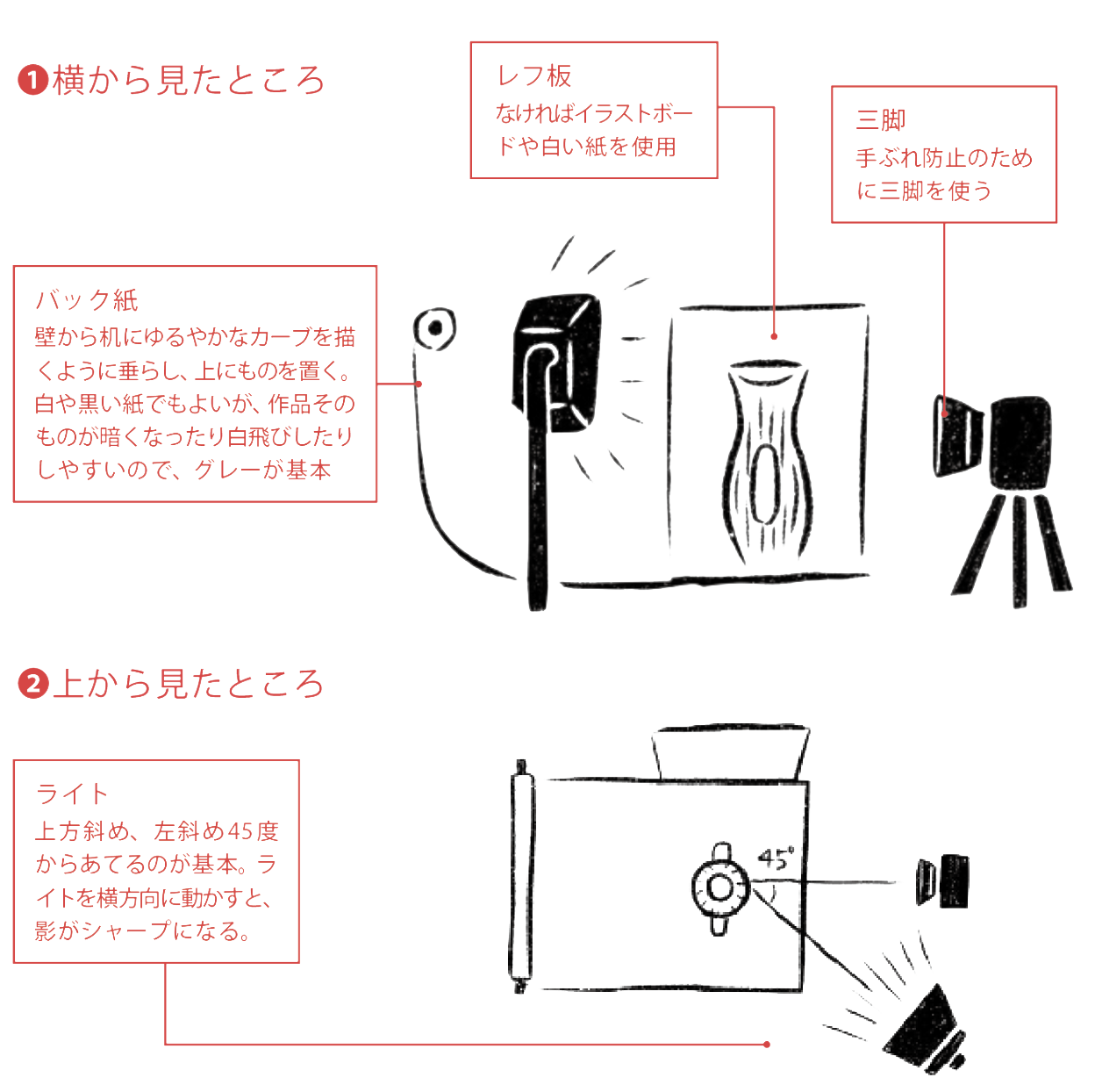 作品撮りの基本は、ライトを上と左からの計2灯をあて、右にレフ板を置いて反射させることで、作品を光でまんべんなく包むようにします。また、直射日光を避け明るい曇天の日に自然光で撮影する選択肢もあります。