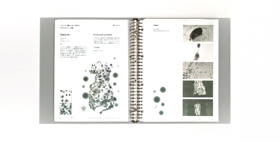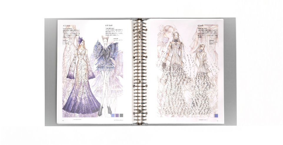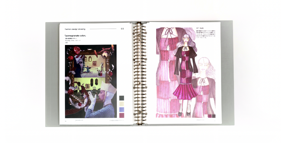 TOPポートフォリオをつくろうFASHION DESIGN詳細 PORTFOLIO DATA形態:ファイル/サイズ:A4縦/頁数:124 POINT 背景の余白をデザイン画で埋めているのがレイアウトとして面白い。ポートフォリオ全体にメリハリがついている。 POINT 作品によっては、あえて余白を大きく残すページを。ページを一目みるだけで、作品の方向性が伝わってくる。